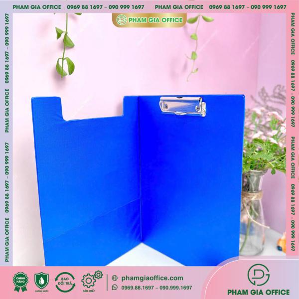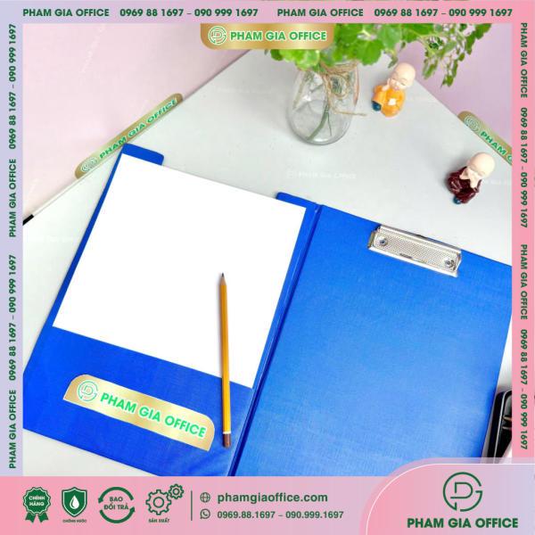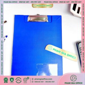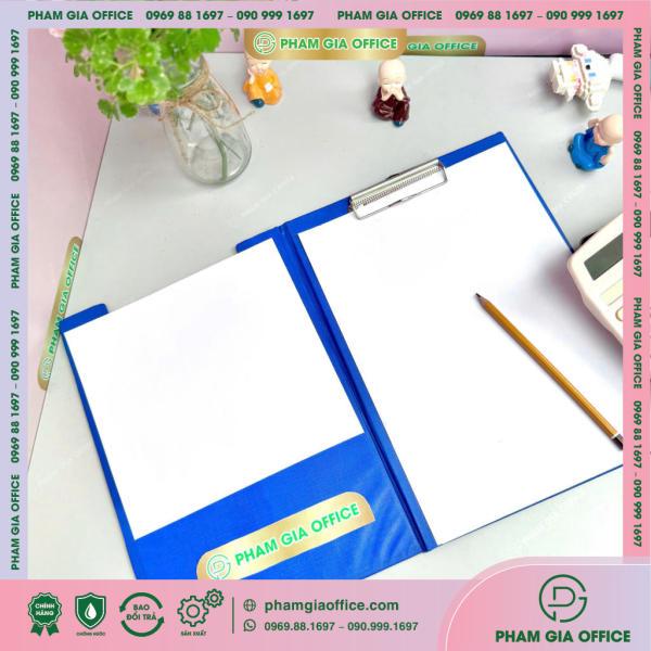 Đặc điểm: là sản phẩm làm từ bìa sơ mi simily thân thiện với môi trường, kẹp inox phía trên để kẹp giấy các khổ A4 – A5.